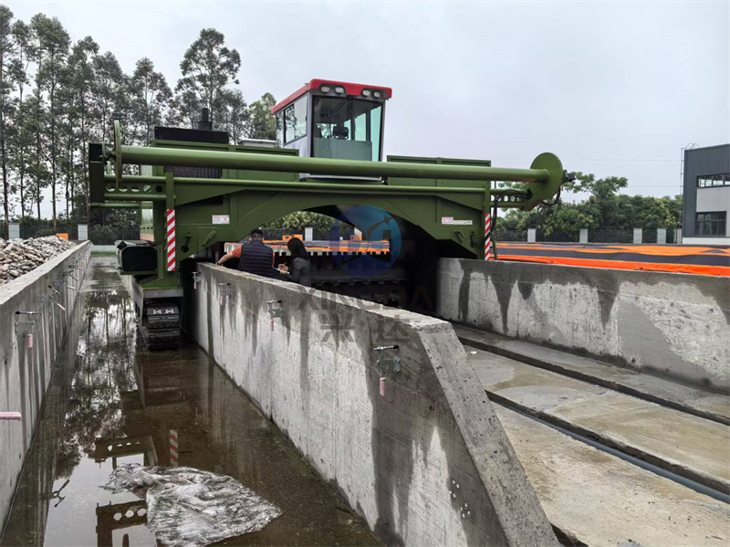 試機現場:完成安裝的5米寬的液壓履帶覆膜翻拋機正在試機: