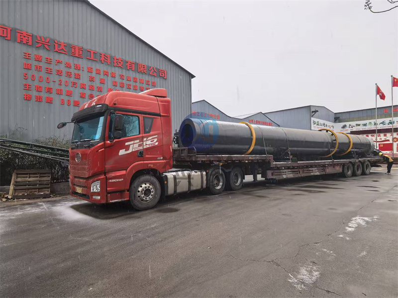 第三車正在裝車的年產3萬噸有機肥生產線準備再次出發:有機肥顆粒生產線主要是將原料發酵腐熟以后含水量約30%-35%的有機廢棄物送入粉碎篩分,后與粘結劑以及需配比的其他成分如:氮磷鉀等元素使所含礦物元素達到所需標準(總養分含量低于15%),然后由攪拌機進行攪拌混合,經充分混合后的物料由皮帶輸送機均勻連續的喂入造粒機制粒,經拋光整形機拋圓成球狀顆粒,出來后用烘干機進行低溫大風量烘干(≤65℃)后進行冷卻、篩分、包膜,合格產品由皮帶輸送到成品料倉,經電腦定量包裝系統計量,包裝入庫,不合格的返回粉碎機進行粉碎再造粒。